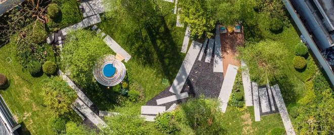 大华星曜售楼处电话:【预约☎】中岛水景,池底采用蓝钻花岗岩和阿尔卑斯灰仿石砖拼花定制星语言铺地,包括两边景墙立面选用高端的爱马仕灰奢石,彰显出石材的大气典雅。包括景墙转角的弧面,工艺难度非常大。