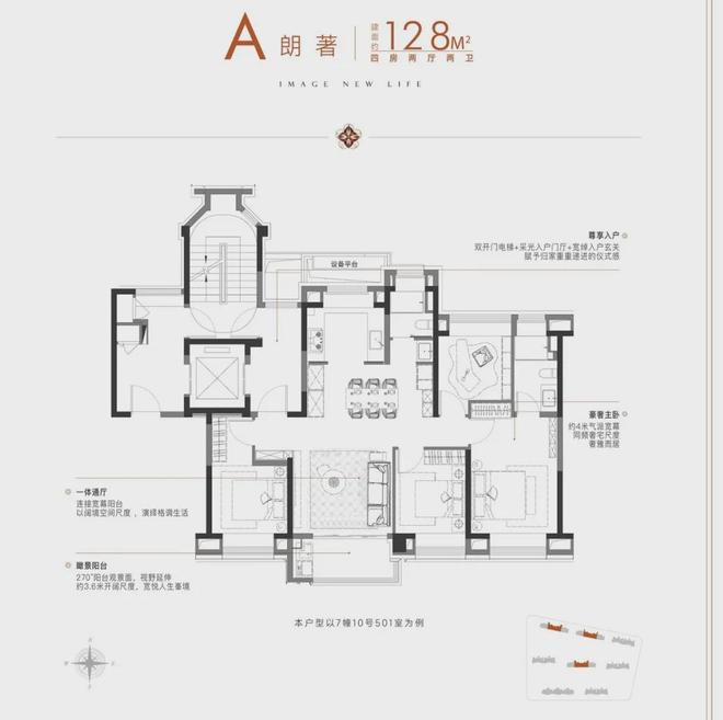 :采用LDK洄游式景观边厅设计,南向面宽达10.3米,主卧套房带270°转角飘窗及独立衣帽间,客餐厅可轻松容纳六人餐桌,得房率约74%。